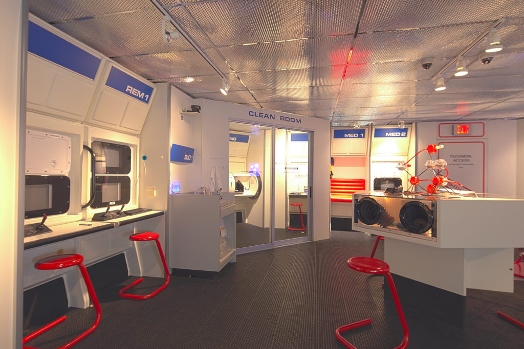 After Nickerson & O’Day visited a Challenger Learning Center program in Virginia and completed the CLC program there, we teamed with local architect John Gordon to create the Challenger Learning Center of Maine-located in a long-vacant theatre building at the decommissioned Dow Air Force Base in Bangor. Within the building, Nickerson & O’Day created the elaborate Space Station and Mission Control rooms along with a breathtaking two-story lobby and adjacent CLC Store. Work was completed on time and 3 1/2% under its $1,100,000 budget.